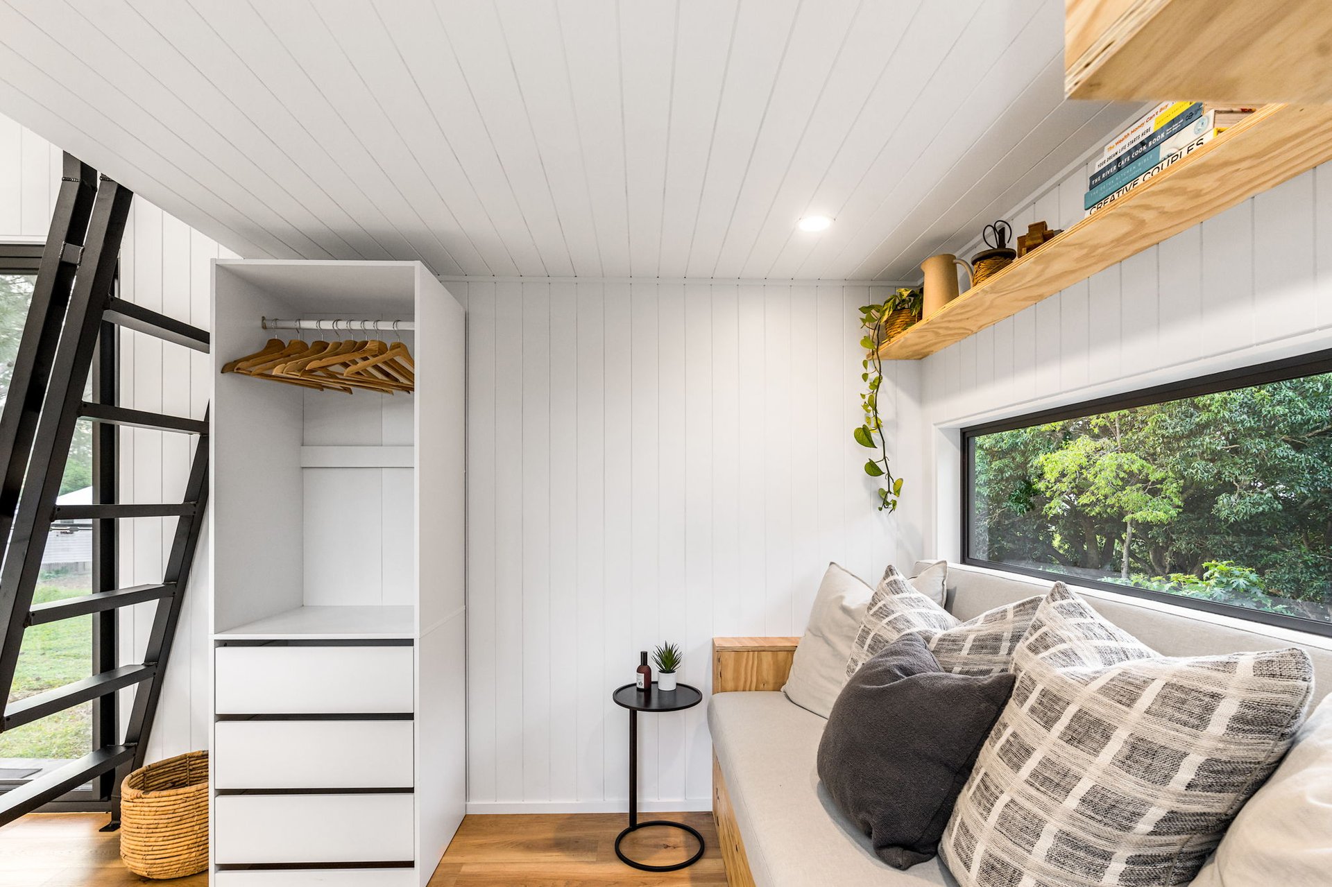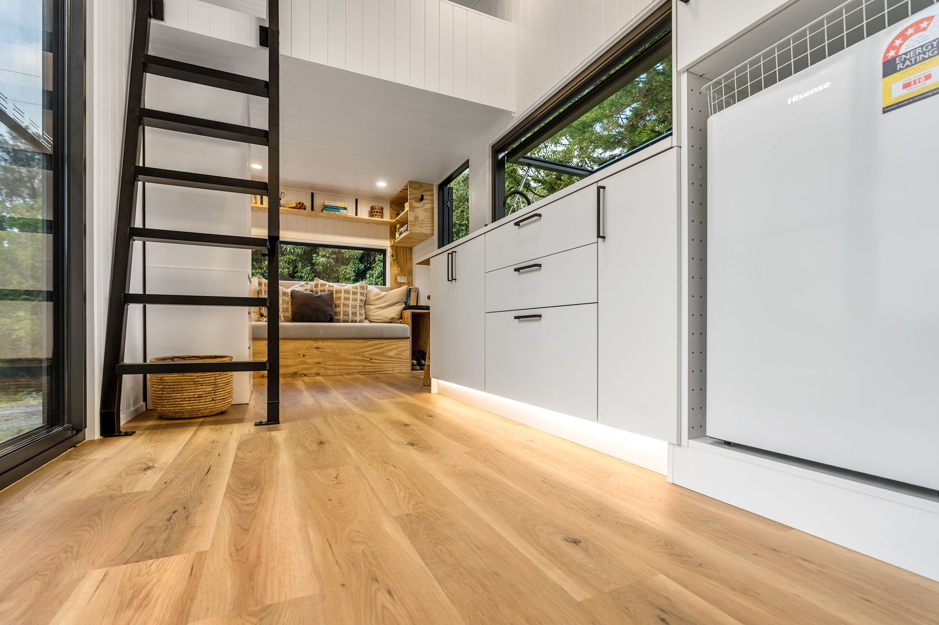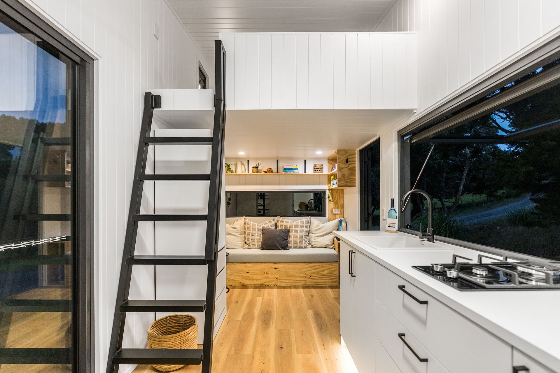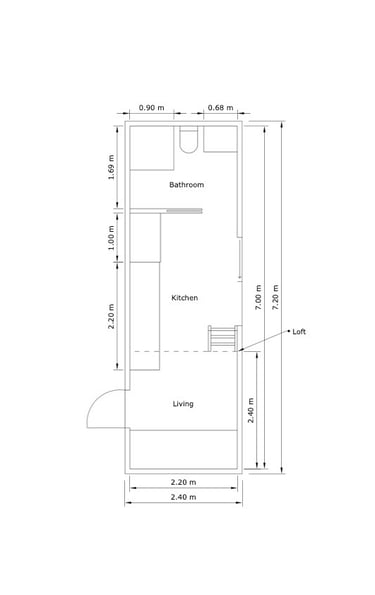The first tiny house on wheels came together from a few basic sketches over a couple years, finally getting built into reality. Measuring 7.2m long and 2.4m wide, this custom-built home features a surprisingly spacious, light-filled interior, with a very large bathroom and kitchen for its size. Integrated bookcase-sofa and a comfortable loft area for sleeping. We prioritized using high-quality materials, and innovative space-saving solutions. Designed for both style and functionality, it showcases our commitment to creating one-of-a-kind tiny homes that blend luxury with functionality.